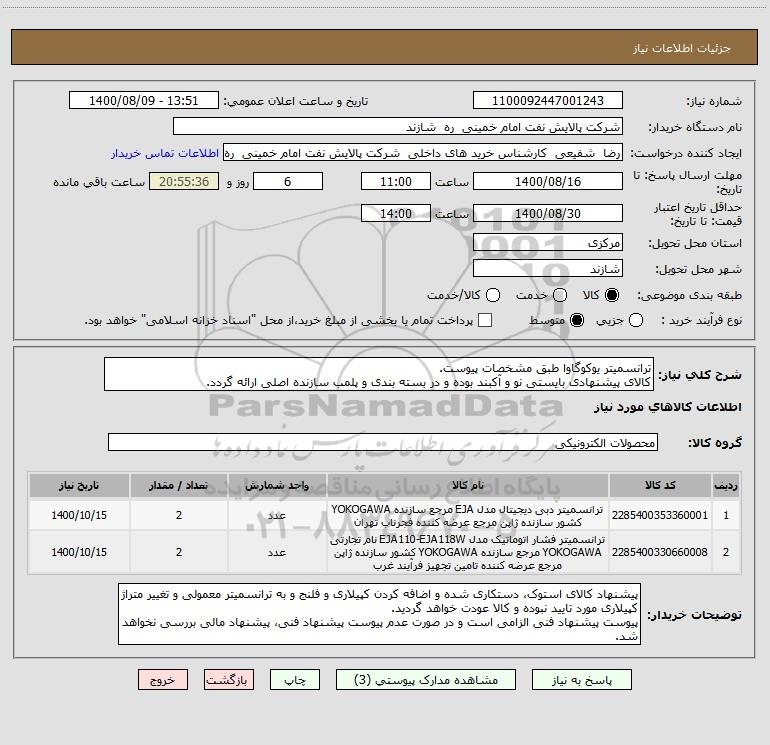 شرح کلی نیاز: ترانسمیتر یوکوگاوا طبق مشخصات پیوست. کالای پیشنهادی بایستی نو و آکبند بوده و در بسته بندی و پلمب سازنده اصلی ارائه گردد.