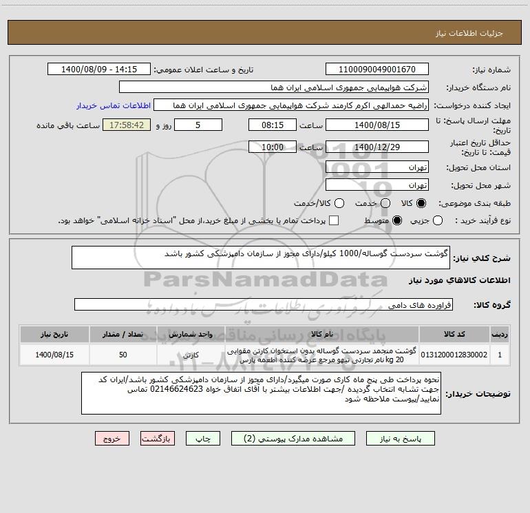 شرح کلی نیاز: گوشت سردست گوساله/1000 کیلو/دارای مجوز از سازمان دامپزشکی کشور باشد
