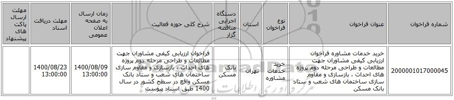 2000001017000045 | خرید خدمات مشاوره فراخوان ارزیابی کیفی مشاوران جهت مطالعات و طراحی مرحله دوم پروژه های احداث ، بازسازی و مقاوم سازی ساختمان های شعب و ستاد بانک مسکن | خرید خدمات مشاوره | تهران | بانک مسکن | فراخوان ارزیابی کیفی مشاوران جهت مطالعات و طراحی مرحله دوم پروژه های احداث ، بازسازی و مقاوم سازی ساختمان های شعب و ستاد بانک مسکن واقع در سطح کشور در سال 1400 طبق اسناد پیوست | 1400/08/09 13:00:00 | 1400/08/23 13:00:00 |
