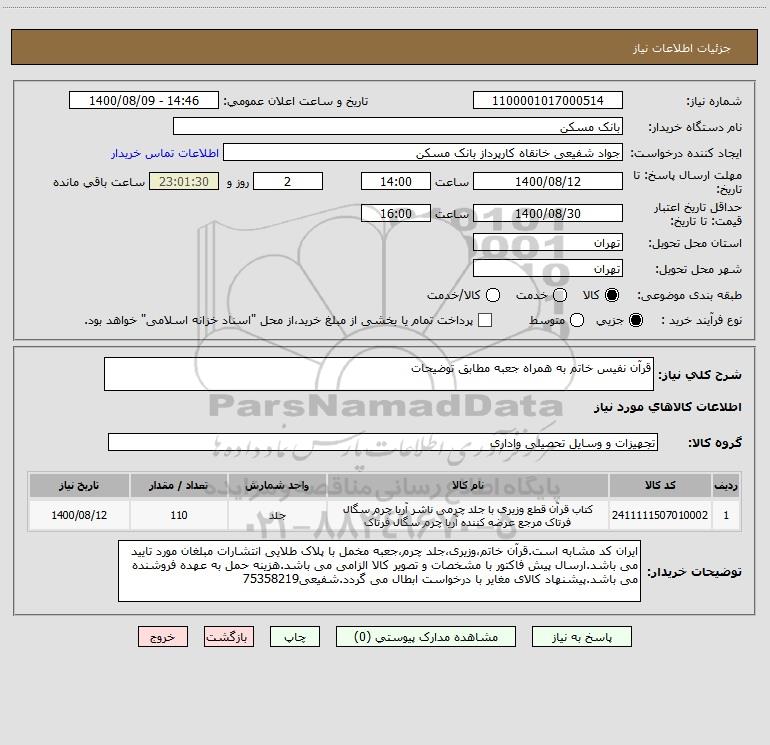 شرح کلی نیاز: قرآن نفیس خاتم به همراه جعبه مطابق توضیحات