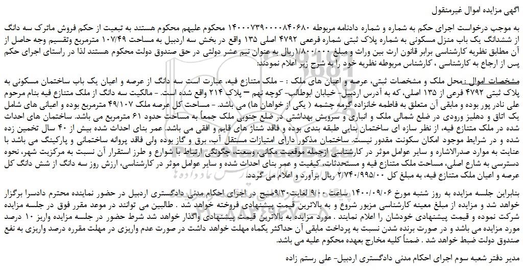 به موجب درخواست اجرای حکم به شماره و شماره دادنامه مربوطه 140007390000840680 محکوم علیهم محکوم هستند به تبعیت از حکم فروش ماترک سه دانگ از ششدانگ یک باب منزل مسکونی به شماره پلاک ثبتی شماره فرععی 4792 اصلی 135 واقع در بخش سه اردبیل به مساحت 107/49 مترمربع وتقسیم وجه حاصل از آن مطابق نظریه کارشناسی برابر قانون ارث بین وراث و مبلغ 1/800/000ریال به عنوان نیم عشر دولتی در حق صندوق دولت محکوم هستند لذا در راستای اجرای حکم پس از ارجاع به کارشناسی ، کارشناس مربوطه نظریه خود را به شرح زیر اعلام نمودند: