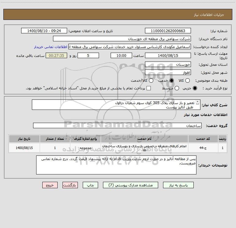 شرح کلی نیاز: تعمیر و باز سازی پلاک 305 کوی سوم شعبان دزفول