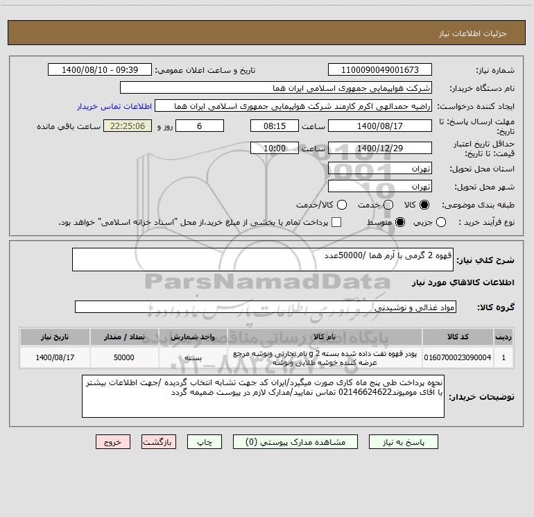 شرح کلی نیاز: قهوه 2 گرمی با آرم هما /50000عدد