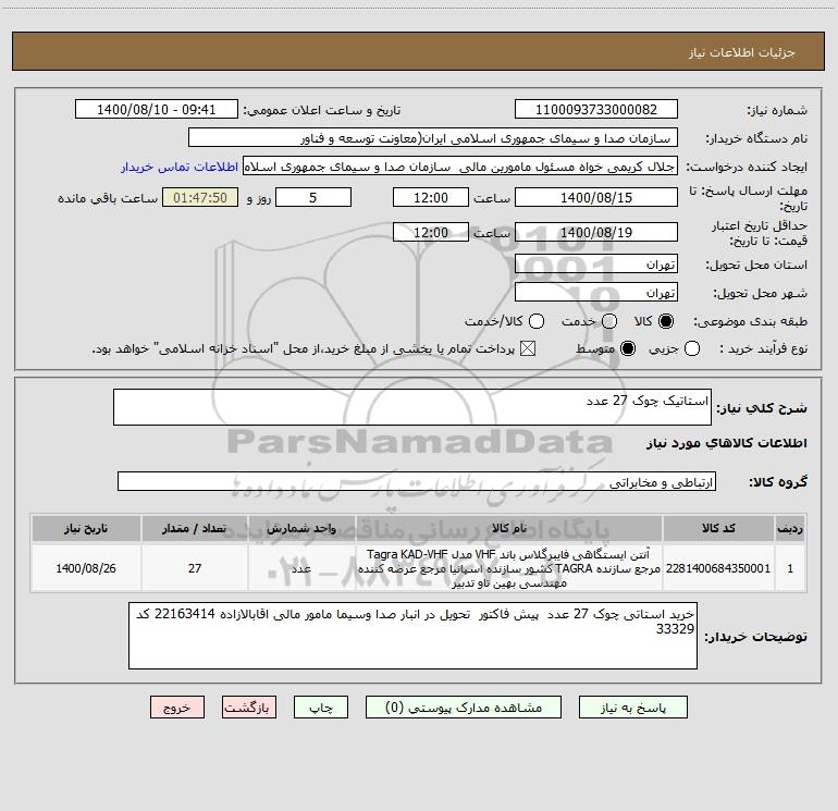 توضیحات خریدار:خرید استاتی چوک 27 عدد پیش فاکتور تحویل در انبار صدا وسیما مامور مالی اقابالازاده 22163414 کد 33329