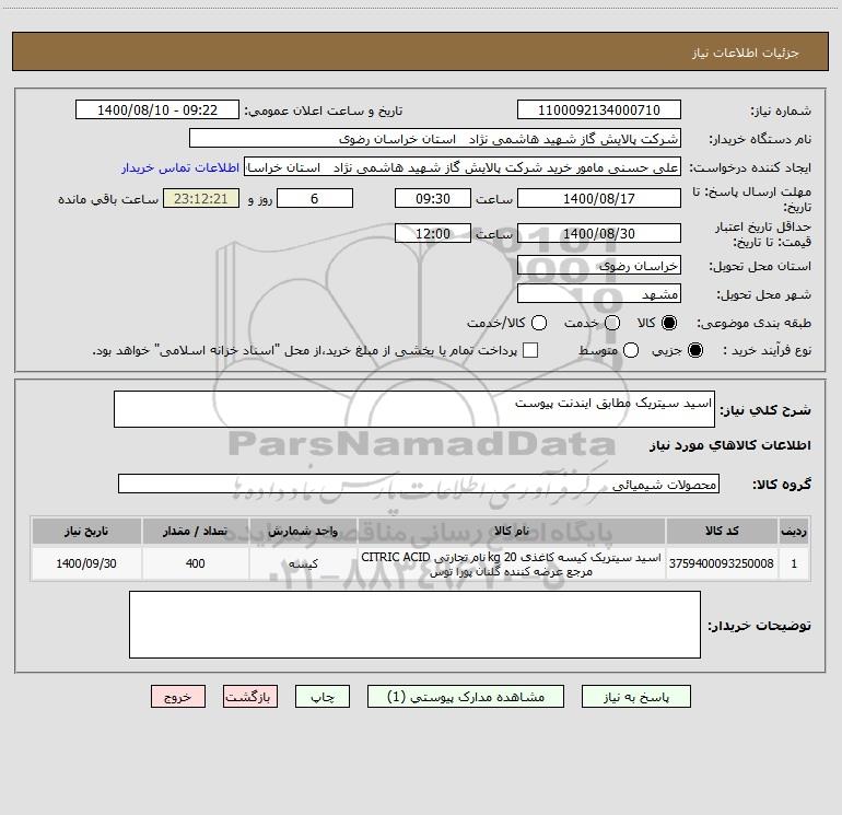 شرح کلی نیاز: اسید سیتریک مطابق ایندنت پیوست