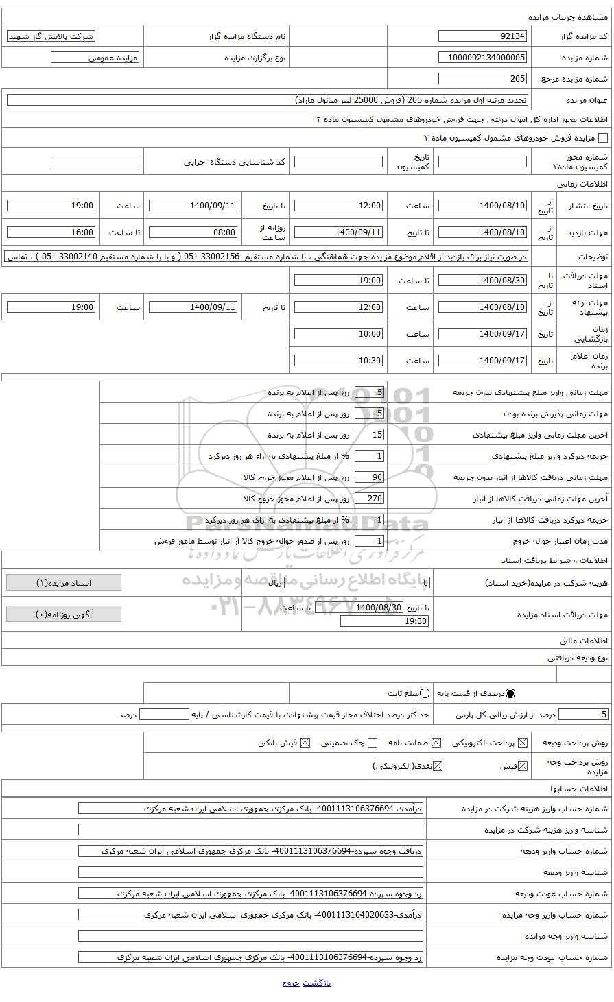 | عنوان مزایده | تجدید مرتبه اول مزایده شماره 205 )فروش 25000لیتر متانول مازاد( | |||