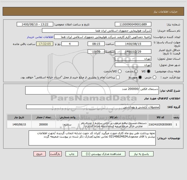 شرح کلی نیاز: دستمال الکلی /200000 عدد