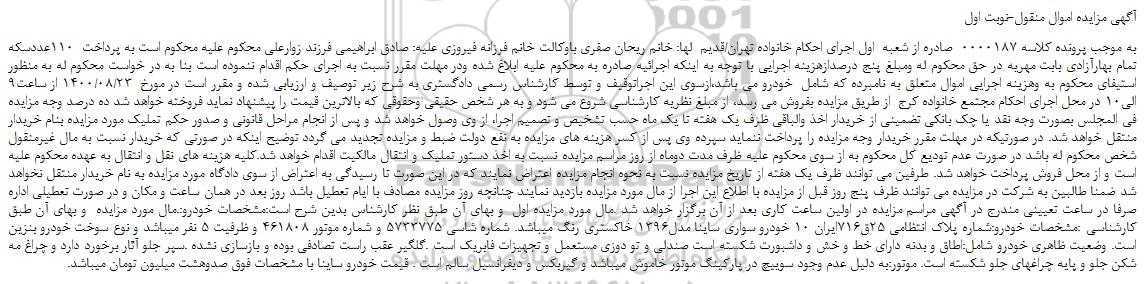به موجب پرونده کلاسه 0000187  صادره از شعبه  اول اجرای احکام خانواده تهران/قدیم  لها: خانم ریحان صفری باوکالت خانم فرزانه فیروزی علیه: صادق ابراهیمی فرزند زوارعلی محکوم علیه محکوم است به پرداخت  110عددسکه تمام بهارآزادی بابت مهریه در حق محکوم له ومبلغ پنج درصدازهزینه اجرایی با توجه به اینکه اجرائیه صادره به محکوم علیه ابلاغ شده ودر مهلت مقرر نسبت به اجرای حکم اقدام ننموده است بنا به در خواست محکوم له به منظور استیفای محکوم به وهزینه اجرایی اموال متعلق به نامبرده که شامل  خودرو می باشد،ازسوی این اجراتوقیف و توسط کارشناس رسمی دادگستری به شرح زیر توصیف و ارزیابی شده و مقرر است در مورخ  1400/08/23 از ساعت9 الی10 در محل اجرای احکام مجتمع خانواده کرج  از طریق مزایده بفروش می رسد، از مبلغ نظریه کارشناسی شروع می شود و به هر شخص حقیقی وحقوقی که بالاترین قیمت را پیشنهاد نماید فروخته خواهد شد ده درصد وجه مزایده فی المجلس بصورت وجه نقد یا چک بانکی تضمینی از خریدار اخذ والباقی ظرف یک هفته تا یک ماه حسب تشخیص و تصمیم اجرا، از وی وصول خواهد شد و پس از انجام مراحل قانونی و صدور حکم تملیک مورد مزایده بنام خریدار منتقل خواهد شد. در صورتیکه در مهلت مقرر خریدار وجه مزایده را پرداخت ننماید سپرده وی پس از کسر هزینه های مزایده به نفع دولت ضبط و مزایده تجدید می گردد توضیح اینکه در صورتی که خریدار نسبت به مال غیرمنقول شخص محکوم له باشد در صورت عدم تودیع کل محکوم به از سوی محکوم علیه ظرف مدت دوماه از روز مراسم مزایده نسبت به اخذ دستور تملیک و انتقال مالکیت اقدام خواهد شد.کلیه هزینه های نقل و انتقال به عهده محکوم علیه است و از محل فروش پرداخت خواهد شد. طرفین می توانند ظرف یک هفته از تاریخ مزایده نسبت به نحوه انجام مزایده اعتراض نمایند که در این صورت تا رسیدگی به اعتراض از سوی دادگاه مورد مزایده به نام خریدار منتقل نخواهد شد ضمنا طالبین به شرکت در مزایده می توانند ظرف پنج روز قبل از مزایده با اطلاع این اجرا از مال مورد مزایده بازدید نمایند چنانچه روز مزایده مصادف با ایام تعطیل باشد روز بعد در همان ساعت و مکان و در صورت تعطیلی اداره صرفا در ساعت تعیینی مندرج در آگهی مراسم مزایده در اولین ساعت کاری بعد از آن برگزار خواهد شد .مال مورد مزایده اول  و بهای آن طبق نظر کارشناس بدین شرح است:مشخصات خودرو:.مال مورد مزایده  و بهای آن طبق کارشناسی :مشخصات خودرو:شماره پلاک انتظامی 25ق716ایران 10 خودرو سواری ساینا مدل1396 خاکستری رنگ میباشد. شماره شاسی 5733775 و شماره موتور 461808 و ظرفیت 5 نفر میباشد و نوع سوخت خودرو بنزین است. وضعیت ظاهری خودرو شامل:اطاق و بدنه دارای خط و خش و داشبورت شکسته است صندلی و تو دوزی مستعمل و تجهیزات فابریک است .گلگیر عقب راست تصادفی بوده و بازسازی نشده .سپر جلو آثار برخورد دارد و چراغ مه شکن جلو و پایه چراغهای جلو شکسته است. موتور:به دلیل عدم وجود سوییچ در پارکینگ موتور خاموش میباشد و گیربکس و دیفرانسیل سالم است . قیمت خودرو ساینا با مشخصات فوق صدوهشت میلیون تومان میباشد.