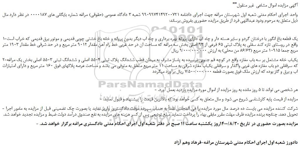 واحد اجرای احکام مدنی شعبه اول شهرستان مراغه جهت اجرای دادنامه 9909974149200721 شعبه 3 دادگاه عمومی (حقوقی) مراغه شماره بایگانی های 0000187 در نظر دارد مال ذیل متعلق به مرحوم ودود عبداللهی فرد از طریق مزایده حضوری بفروش برساند: