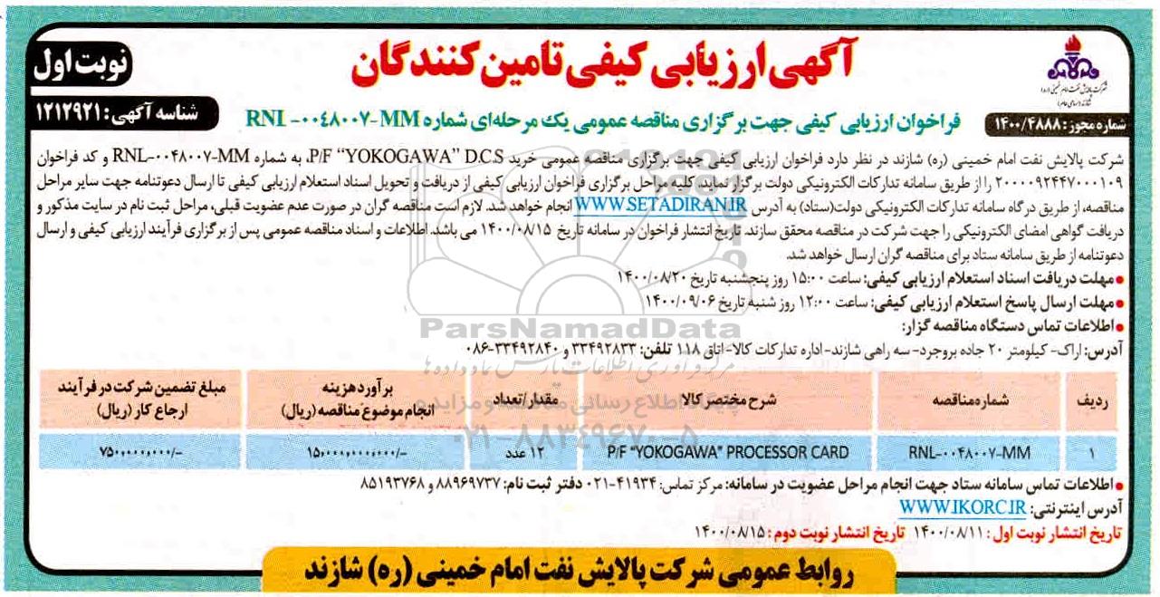 ارزیابی کیفی تامین کننده P/F "YOKOGAWA" PROCESSOR CARD از کلیه افراد متخصص و شرکتها واجد شرایط دعوت به عمل میآید در مناقصه با کد خبرگزاری پارس نماد: 3908291 شرکت نمایند.