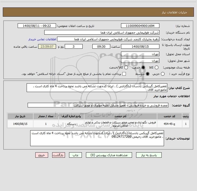 شرح کلی نیاز: تعمیرکامل گیربکس بادسان (باگارانتی ) . ایران کدجهت تشابه می باشد نحوه پرداخت 4 ماه کاری است . مامورخرید آقای