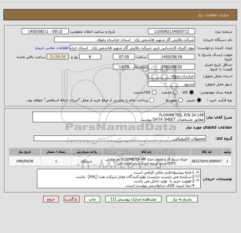 نام دستگاه خریدار:شرکت پالایش گاز شهید هاشمی نژاد استان خراسان رضوی