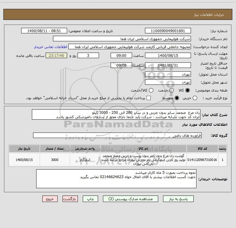 شرح کلی نیاز: ران مرغ منجمد سایز بدون چربی و در سایز 280 الی 250 - 3000 کیلو