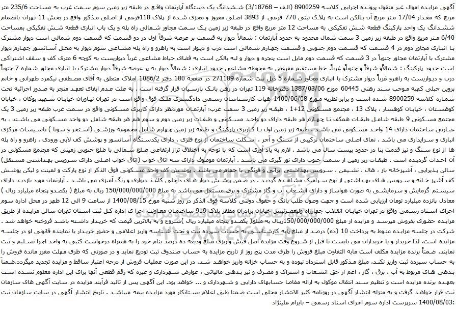 متن آگهی: آگهی مزایده اموال غیر منقول پرونده اجرایی کلاسه 8900259 (الف – 3/18768) ششدانگ یک دستگاه آپارتمان واقع در طبقه زیر زمین سوم سمت غرب به مساحت 235/6 متر مربع که مقدار 17/04 متر مربع آن بالکن است به پلاک ثبتی 770 فرعی از 3893 اصلی مفروز و مجزی شده از پلاک 118فرعی از اصلی مذکور واقع در بخش 11 تهران بانضمام ششدانگ یک واحد پارکینگ قطعه شش تفکیکی به مساحت 12 متر مربع واقع در طبقه زیر زمین یک سمت مجاور شمالی راه پله و یک باب انباری قطعه شش تفکیکی بمساحت 6/40 متر مربع واقع در طبقه زیر زمین 3 سمت شمال محدود به حدود آپارتمان : شمالاً دیوار به قسمت پر عرصه شرقاً اول در دو قسمت که قسمت دوم شمالی است دیوار مشترک با انباری مجاور دوم در 4 قسمت که قسمت دوم جنوبی و قسمت چهارم شمالی است درب و دیوار است به راهرو و راه پله مشاعی سوم دیوار به محل آسانسور چهارم دیوار مشترک با آپارتمان مجاور جنوباً در 3 قسمت که قسمت دوم مایل است پنجره و دیوار و لبه بالکن است به فضای حیاط مشاعی غرباً دیواریست به کوچه 6 متری کف و سقف اشتراکی است حدود پارکینگ : شمالاًو شرقاً و جنوباًو غرباً. خط مستقیم مفروض به محوطه مشاعی حدود انباری : شمالاً دیوار به پر عرصه شرقاً دیوار مشترک با انباری مجاور شماره 7 جنوباً درب و دیواریست به راهرو غرباً دیوار مشترک با انباری مجاور شماره 5 ذیل ثبت شماره 271189 در صفحه 180 دفتر 1086/2 املاک متعلق به آقای مصطفی نیکمرد طهرانی و خانم پروین جبلی کهبه موجب سند رهنی 60445 مورخ 1387/03/06 دفترخانه 119 تهران در رهن بانک پارسیان قرار گرفته است . به علت عدم ایفای تعهد منجر به صدور اجرائیه تحت شماره کلاسه 8900259 شده است و برابر نظریه مورخ 1400/06/08 هیات کارشناسان رسمی دادگستری ملک فوق واقع است در تهران نیاوران خیابان شهید بوکان ، خیابان کوهستان ، خیابان کوهسار ، پلاک 13 ، مجتمع مسکونی 12+1 ، طبقه زیر زمین 3 سمت غرب؛ آپارتمان موردنظر دارای کاربری مسکونی واقع در سمت غرب طبقه زیر زمین 3 یک مجتمع مسکونی 9 طبقه شامل طبقات همکف تا چهارم هر طبقه دارای دو واحد مسکونی و طبقات زیر زمین دوم و سوم هم هر طبقه شامل دو واحد مسکونی می باشند ، به عبارتی ساختمان دارای 14 واحد مسکونی می باشد . طبقه زیر زمین اول با کاربری پارکینگ و طبقه زیر زمین چهارم شامل مجموعه ورزشی (استخر و سونا ) تاسیسات مرکزی انباری و سرایداری می باشد . نمای اصلی ساختمان ترکیبی از سنگ و آجر ، اسکلت ساختمان از نوع فلزی ، دارای یکدستگاه آسانسور و پوشش کف لابی ورودی ، راهرو و راه پله ها از نوع سنگ و نیز قدمت بنا در حدود بیست سال می باشد . لازم به یاد آوری است که با توجه به اختلاف تراز ارتفاعی ضلع شمالی با ضلع جنوبی زمینی که مجتمع مسکونی در آن احداث گردیده است . طبقات زیر زمین از سمت جنوب دارای نور گیری می باشد . آپارتمان موصوف دارای سه اتاق خواب (اتاق خواب اصلی دارای سرویس بهداشتی مستقل) سالن پذیرایی ، آشپزخانه باز ، هال ، نشیمن ، سرویس بهداشتی ایرانی و فرنگی با حمام می باشد . پوشش کف واحد مسکونی فوق الذکر از نوع پارکت و لمینت و لیکن پوشش کف آشپز خانه و سرویس های بهداشتی از نوع سرامیک مشاهده گردید . در ضمن پوشش دیوار های داخلی کاغذ دیواری و رنگ آمیزی می باشد . آپارتمان مورد بازدید دارای سیستم گرمایش و سرمایشی به صورت هواساز و دارای انشعاب آب و گاز مشترک و برق مستقل می باشد به مبلغ 150/000/000/000 ریال به مبلغ ( یکصدو پنجاه میلیارد ریال ) معادل پانزده میلیارد تومان ارزیابی شده است و جهت وصول طلب بانک و حقوق دولتی کلاسه فوق الذکر در روز شنبه مورخ 1400/08/15 از ساعت 9 الی 12 ظهر در محل اداره سوم اجرای اسناد رسمی واقع در تهران خیابان انقلاب چهارراه ولیعصرنبش خیابان برادران مظفر پلاک 919 ساختمان معاونت اجرا ی اداره کل ثبت استان تهران سالن مزایده از طریق مزایده حضوری بفروش میرسد و مزایده از مبلغ 150/000/000/000ریال به مبلغ( یکصدو پنجاه میلیارد ریال )شروع و به بالاترین قیمت که خریدار داشته باشد فروخته خواهد شد . شرکت در جلسه مزایده منوط به پرداخ