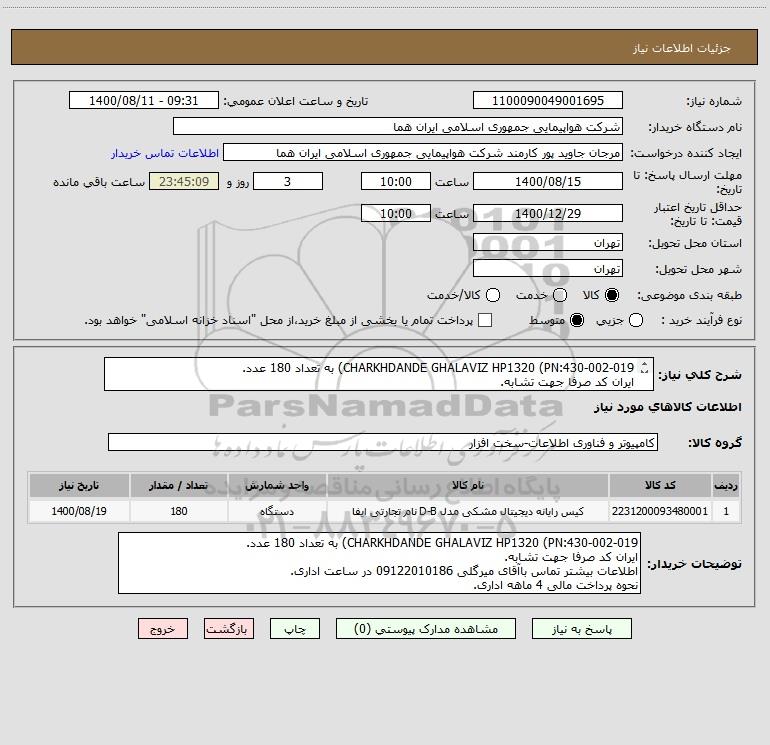 استعلام CHARKHDANDE GHALAVIZ HP1320 (PN:430-002-019) به تعداد 180 عدد.