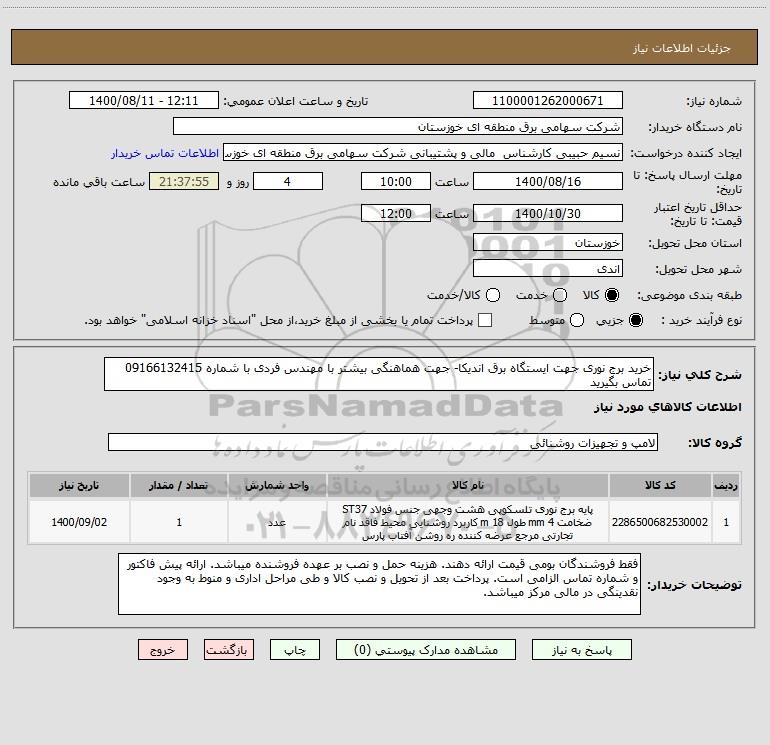 شرح کلی نیاز: خرید برج نوری جهت ایستگاه برق اندیکا- جهت هماهنگی بیشتر با مهندس فردی با شماره 09166132415 تماس بگیرید