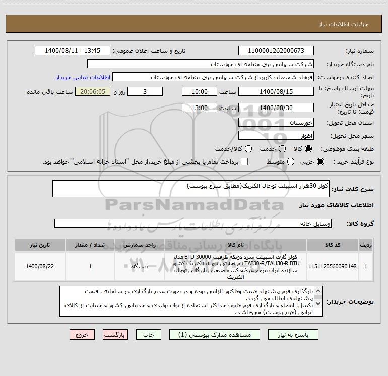 شرح کلی نیاز: کولر 30هزار اسپیلت توچال الکتریک(مطابق شرح پیوست)