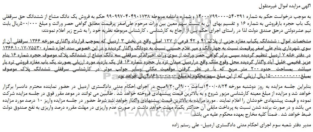 مشخصات اموال : ششدانگ یکباب مغازه جزیی از پلاک 41 و 42 فرعی از 127 اصلی واقع در بخش 3 اردبیل که بموجب قرارداد واگذاری مورخه 1366 سرقفلی آن از سوی شهرداری بنام علی اصغر پرقیمت نسبت به چهاردانگ و میر غلام حسینی نسبت به دودانگ واگذار گردیده و در این خصوص سند اجاره شماره 75530-1366.10.17 در دفتر خانه 7 اردبیل تنظیم گردیده سپس برابر گواهی حصر وراثت از سوی وراث اخیرالذکر سرقفلی سه دانگ مشاع از ششدانگ پلاک موصوف حجره شماره 16 بنام عزیز فخیمی خلیل آباد واگذار گردیده محل وقوع ملک واقع دراردبیل میدان تره بار حجره شماره 16 فاز یک بازدید مورد ارزیابی بصورت یک باب مغازه فروشی تره بار میباشد بمساحت حدود 200 متر مربع که با در نظر گرفتن موقعیت مکانی وسایر جوانب موثر در کارشناسی سرقفلی ششدانگ پلاک موصوف بمبلغ150.000.000.000ریال ارزیابی که از این مبلغ سهم محکوم له مبلغ 4.861.000.000ریال خواهد بود