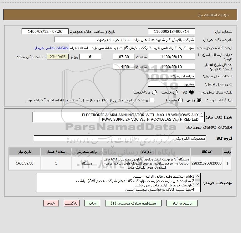 نام دستگاه خریدار:شرکت پالایش گاز شهید هاشمی نژاد استان خراسان رضوی
