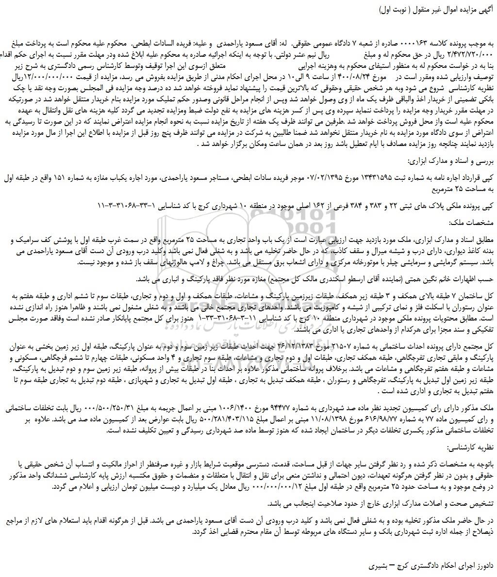 به موجب پرونده کلاسه 0000163 صادره از شعبه 7 دادگاه عمومی حقوقی. له: آقای مسعود یاراحمدی و علیه: فریده السادات ابطحی. محکوم علیه محکوم است به پرداخت مبلغ 2/472/720/000 ریال در حق محکوم له و مبلغ ریال نیم عشر دولتی. با توجه به اینکه اجرائیه صادره به محکوم علیه ابلاغ شده ودر مهلت مقرر نسبت به اجرای حکم اقدام ننموده است بنا به در خواست محکوم له به منظور استیفای محکوم به وهزینه اجرایی متعلق ازسوی این اجرا توقیف وتوسط کارشناس رسمی دادگستری به شرح زیر توصیف وارزیابی شده ومقرر است در مورخ 400/08/24 از ساعت 9 الی10 در محل اجرای احکام مدنی از طریق مزایده بفروش می رسد، مزایده از قیمت 12/000/000/000ریال نظریه کارشناسی شروع می شود وبه هر شخص حقیقی وحقوقی که بالاترین قیمت را پیشنهاد نماید فروخته خواهد شد ده درصد وجه مزایده فی المجلس بصورت وجه نقد یا چک بانکی تضمینی از خریدار اخذ والباقی ظرف یک ماه از وی وصول خواهد شد وپس از انجام مراحل قانونی وصدور حکم تملیک مورد مزایده بنام خریدار منتقل خواهد شد در صورتیکه در مهلت مقرر خریدار وجه مزایده را پرداخت ننماید سپرده وی پس از کسر هزینه های مزایده به نفع دولت ضبط ومزایده تجدید می گردد کلیه هزینه های نقل وانتقال به عهده محکوم علیه است واز محل فروش پرداخت خواهد شد .طرفین می توانند ظرف یک هفته از تاریخ مزایده نسبت به نحوه انجام مزایده اعتراض نمایند که در این صورت تا رسیدگی به اعتراض از سوی دادگاه مورد مزایده به نام خریدار منتقل نخواهد شد ضمنا طالبین به شرکت در مزایده می توانند ظرف پنج روز قبل از مزایده با اطلاع این اجرا از مال مورد مزایده بازدید نمایند چنانچه روز مزایده مصادف با ایام تعطیل باشد روز بعد در همان ساعت ومکان برگزار خواهد شد .