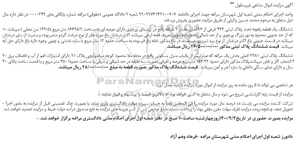 1- ششدانگ یک قطعه باغچه تحت پلاک ثبتی 433 فرعی از 97 اصلی بخش 3 مراغه واقع در روستای ورجوی دارای عرصه ای به مساحت 16695/9 متر مربع (132/5 من محلی ) میباشد که از حد جنوبی محدود به نهر بزرگ ورجوی و از حد شمالی محدود به جوی معروف قلعه ارخی میباشد اکثر درختان باغ مورد نظر از نوع درخت گردو مثمر بوده و بندرت از سایر درختان میباشد در قسمت جنوبی باغ اکثر درختان از نوع بید تبریزی میباشند در باغ مذکور خانه باغ فرسوده به مساحت حدود 12 متر مربع با سازه خشتی و چوبی وجود دارد باغ دارای حق آبه میباشد قیمت ششدانگ پلاک ثبتی مذکور 26/500/000/000 ریال میباشد.