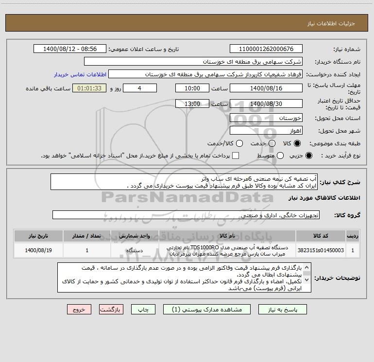 نام دستگاه خریدار:شرکت سهامی برق منطقه ای خوزستان