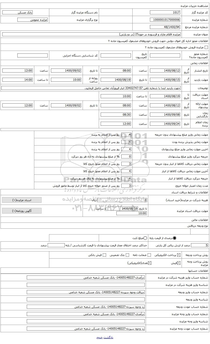 کد مزایده گزار | 1017 | نام دستگاه مزایده گزار | بانک مسکن | |