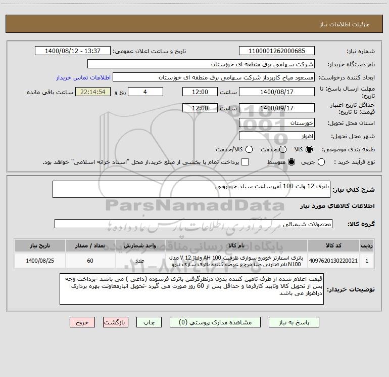 شرح کلی نیاز: باتری 12 ولت 100 آمپرساعت سیلد خودرویی