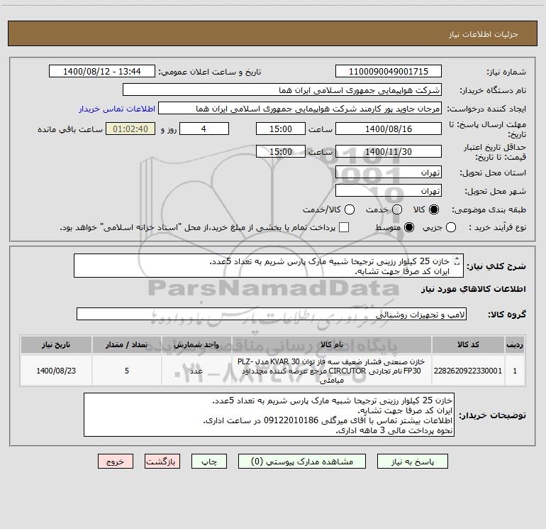 شرح کلی نیاز: خازن 25 کیلوار رزینی ترجیحا شبیه مارک پارس شریم به تعداد 5عدد.