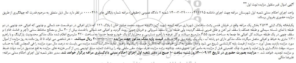 یکبابخانه پلاک ثبتی 3524 بخش یک مراغه واقع در خیابان قدس پشت ساختمان شهرداری مراغه کوچه شهید آژین (کوچه مسجد محمد صادق خان ) پلاک 121 که دارای اعیانی در دو قسمت حد شمالی و جنوبی که اعیانی حد جنوبی در دو طبقه با نمای شسته سیمانی و طبقه همکف با سقف تیر آهن و طاق ضربی مسقف گردیده ولی طبقه اول با سقف شیروانی و خرپای چوبی رویت گردید و اعیانی حد شمالی با قدمت بیش از 40 سال و مصالح مختلط سنتی (آجر و خشت خام ) و سقف چوبی در یک طبقه میباشد کل اعیانی ها جمعا به مساحت حدود 355 مترمربع میباشد و کل عرصه با راهرو دسترسی و محل پارک یک خودرو جمعا حدودا به مساحت 420 مترمربع اعلام شده ملک مذکور محدودیت پارکینگ و با راهرو 1/30 متری به حیاط و اعیانی متصل میگردد ملک مذکور دارای دو رشته آب ، یک یک رشته برق و گاز میباشد. قیمت پایه ملک مذکور جهت مزایده 20/000/000/000 ریال میباشد.  - هر شخصی می تواند تا 5 روز مانده به روز مزایده از اموال مورد مزایده بازدید بعمل آورد. - مزایده از قیمت پایه کارشناسی شروع می شود و مال متعلق به کسی خواهد بود که بالاترین قیمت را پیشنهاد و قبول نماید. - شرکت کننده مزایده می بایست ده درصد مال مورد مزایده را فی المجلس نقداً به حساب سپرده موقت دادگستری واریز نماید یا بصورت چک تضمینی قبل از مزایده به مامور اجرا تحویل دهد. چنانچه برنده مزایده ظرف مهلت مقرر مابقی بهاء را پرداخت ننماید مبلغ تودیعی پس از کسر هزینه های مزایده به نفع صندوق درآمد دولت ضبط و مزایده تجدید خواهد شد. - مزایده بصورت حضوری در تاریخ 1400/09/13روز شنبه ساعت 10 صبح در دفتر شعبه اول اجرای احکام مدنی دادگستری مراغه برگزار خواهد شد. مدیر دفتر شعبه اول اجرای احکام مدنی مراغه-علیرضا ملکی