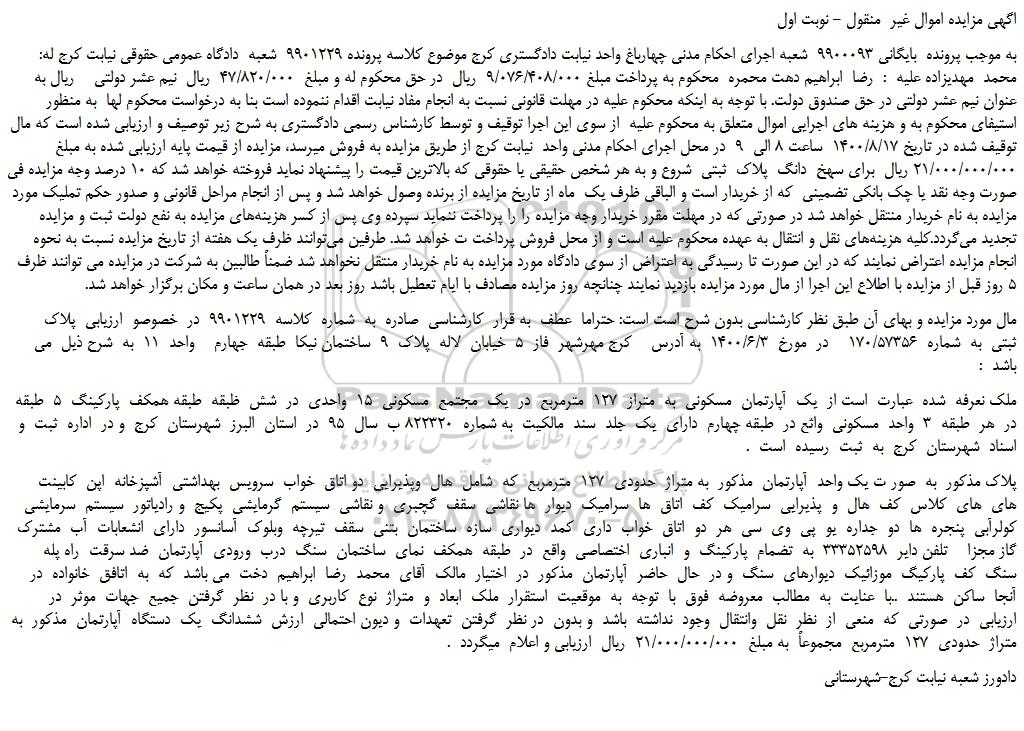 به موجب پرونده بایگانی 9900093 شعبه اجرای احکام مدنی چهارباغ واحد نیابت دادگستری کرج موضوع کلاسه پرونده 9901229 شعبه دادگاه عمومی حقوقی نیابت کرج له: محمد مهدیزاده علیه : رضا ابراهیم دهت محمره محکوم به پرداخت مبلغ 9/076/408/000 ریال در حق محکوم له و مبلغ 47/820/000 ریال نیم عشر دولتی ریال به عنوان نیم عشر دولتی در حق صندوق دولت. با توجه به اینکه محکوم علیه در مهلت قانونی نسبت به انجام مفاد نیابت اقدام ننموده است بنا به درخواست محکوم لها به منظور استیفای محکوم به و هزینه های اجرایی اموال متعلق به محکوم علیه از سوی این اجرا توقیف و توسط کارشناس رسمی دادگستری به شرح زیر توصیف و ارزیابی شده است که مال توقیف شده در تاریخ 1400/8/17 ساعت 8 الی 9 در محل اجرای احکام مدنی واحد نیابت کرج از طریق مزایده به فروش میرسد، مزایده از قیمت پایه ارزیابی شده به مبلغ 21/000/000/000 ریال برای سهخ دانگ پلاک ثبتی شروع و به هر شخص حقیقی یا حقوقی که بالاترین قیمت را پیشنهاد نماید فروخته خواهد شد که ۱۰ درصد وجه مزایده فی المجلس به صورت وجه نقد یا چک بانکی تضمینی که از خریدار است و الباقی ظرف یک ماه از تاریخ مزایده از برنده وصول خواهد شد و پس از انجام مراحل قانونی و صدور حکم تملیک مورد مزایده به نام خریدار منتقل خواهد شد در صورتی که در مهلت مقرر خریدار وجه مزایده را را پرداخت ننماید سپرده وی پس از کسر هزینه های مزایده به نفع دولت ثبت و مزایده تجدید می گردد.کلیه هزینه های نقل و انتقال به عهده محکوم علیه است و از محل فروش پرداخت ت خواهد شد. طرفین می توانند ظرف یک هفته از تاریخ مزایده نسبت به نحوه انجام مزایده اعتراض نمایند که در این صورت تا رسیدگی به اعتراض از سوی دادگاه مورد مزایده به نام خریدار منتقل نخواهد شد ضمناً طالبین به شرکت در مزایده می توانند ظرف ۵ روز قبل از مزایده با اطلاع این اجرا از مال مورد مزایده بازدید نمایند چنانچه روز مزایده مصادف با ایام تعطیل باشد روز بعد در همان ساعت و مکان برگزار خواهد شد.