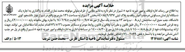مزایده اجاره یک دستگاه اپارتمان مسکونی به پلاک ثبتی 540.849.937
