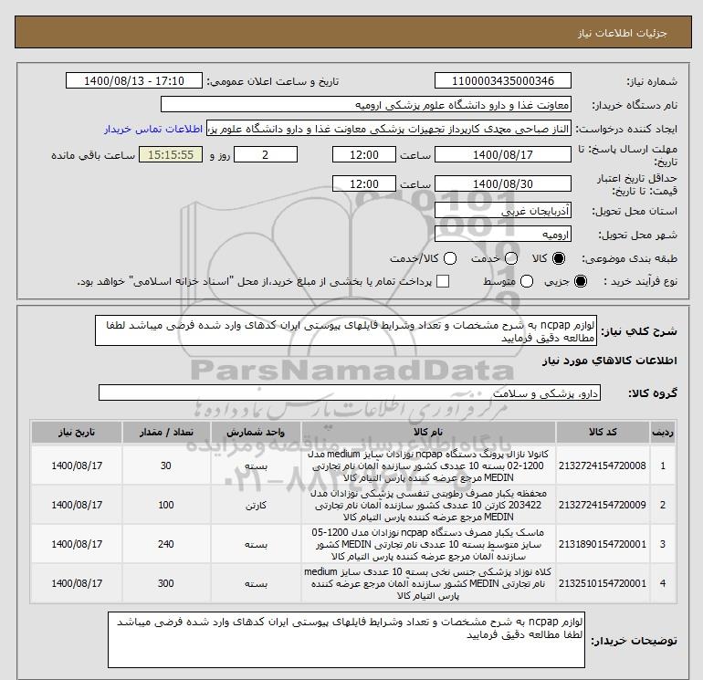 شرح کلی نیاز: لوازم ncpap به شرح مشخصات و تعداد وشرایط فایلهای پیوستی ایران کدهای وارد شده فرضی میباشد لطفا مطالعه دقیق فرمایید