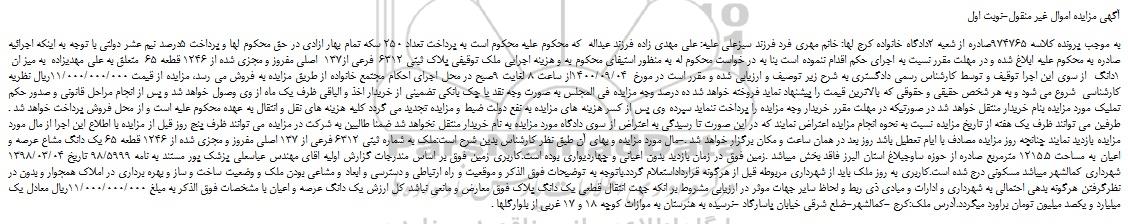 به موجب پرونده کلاسه 974765صادره از شعبه 2دادگاه خانواده کرج لها: خانم مهری فرد فرزند سبزعلی علیه: علی مهدی زاده فرزند عبداله که محکوم علیه محکوم است به پرداخت تعداد 250 سکه تمام بهار ازادی در حق محکوم لها و پرداخت 5درصد نیم عشر دولتی با توجه به اینکه اجرائیه صادره به محکوم علیه ابلاغ شده و در مهلت مقرر نسبت به اجرای حکم اقدام ننموده است بنا به در خواست محکوم له به منظور استیفای محکوم به و هزینه اجرایی ملک توقیفی پلاک ثبتی 6312 فرعی از137 اصلی مفروز و مجزی شده از 1246 قطعه 65 متعلق به علی مهدیزاده به میز ان 1دانگ از سوی این اجرا توقیف و توسط کارشناس رسمی دادگستری به شرح زیر توصیف و ارزیابی شده و مقرر است در مورخ 1400/09/04از ساعت 8 لغایت 9صبح در محل اجرای احکام مجتمع خانواده از طریق مزایده به فروش می رسد، مزایده از قیمت 11/000/000/000ریال نظریه کارشناسی شروع می شود و به هر شخص حقیقی و حقوقی که بالاترین قیمت را پیشنهاد نماید فروخته خواهد شد ده درصد وجه مزایده فی المجلس به صورت وجه نقد یا چک بانکی تضمینی از خریدار اخذ و الباقی ظرف یک ماه از وی وصول خواهد شد و پس از انجام مراحل قانونی و صدور حکم تملیک مورد مزایده بنام خریدار منتقل خواهد شد در صورتیکه در مهلت مقرر خریدار وجه مزایده را پرداخت ننماید سپرده وی پس از کسر هزینه های مزایده به نفع دولت ضبط و مزایده تجدید می گردد کلیه هزینه های نقل و انتقال به عهده محکوم علیه است و از محل فروش پرداخت خواهد شد . طرفین می توانند ظرف یک هفته از تاریخ مزایده نسبت به نحوه انجام مزایده اعتراض نمایند که در این صورت تا رسیدگی به اعتراض از سوی دادگاه مورد مزایده به نام خریدار منتقل نخواهد شد ضمنا طالبین به شرکت در مزایده می توانند ظرف پنج روز قبل از مزایده با اطلاع این اجرا از مال مورد مزایده بازدید نمایند چنانچه روز مزایده مصادف با ایام تعطیل باشد روز بعد در همان ساعت و مکان برگزار خواهد شد .-مال مورد مزایده و بهای آن طبق نظر کارشناس بدین شرح است:ملک به شماره ثبتی 6312 فرعی از 137 اصلی مفروز و مجزی شده از 1246 قطعه 65 یک دانگ مشاع عرصه و اعیان به مساحت 1215.5 مترمربع صادره از حوزه ساوجبلاغ استان البرز فاقد بخش میباشد .زمین فوق در زمان بازدید بدون اعیانی و چهاردیواری بوده است.کاربری زمین فوق بر اساس مندرجات گزارش اولیه اقای مهندس عباسعلی پزشک پور مستند به نامه 98/5999 تاریخ 1398/03/04 شهرداری کمالشهر میباشد مسکونی درج شده است.کاربری به روز ملک باید از شهرداری مربوطه قبل از هرگونه قرارداداستعلام گردد.باتوجه به توضیحات فوق الذکر و موقعیت و راه ارتباطی و دسترسی و ابعاد و مشاعی بودن ملک و وضعیت ساخت و ساز و بهره برداری در املاک همجوار و بدون در نظرگرفتن هرگونه بدهی احتمالی به شهرداری و ادارات و مبادی ذی ربط و لحاظ سایر جهات موثر در ارزیابی مشروط بر انکه جهت انتقال قطعی یک دانگ پلاک فوق معارض و مانعی نباشد کل ارزش یک دانگ عرصه و اعیان با مشخصات فوق الذکر به مبلغ 11/000/000/000ریال معادل یک میلیارد و یکصد میلیون تومان براورد میگردد.آدرس ملک:کرج -کمالشهر-ضلع شرقی خیابان پاسارگاد -نرسیده به هنرستان به موازات کوچه 18 و 17 غربی از بلوارگلها .
