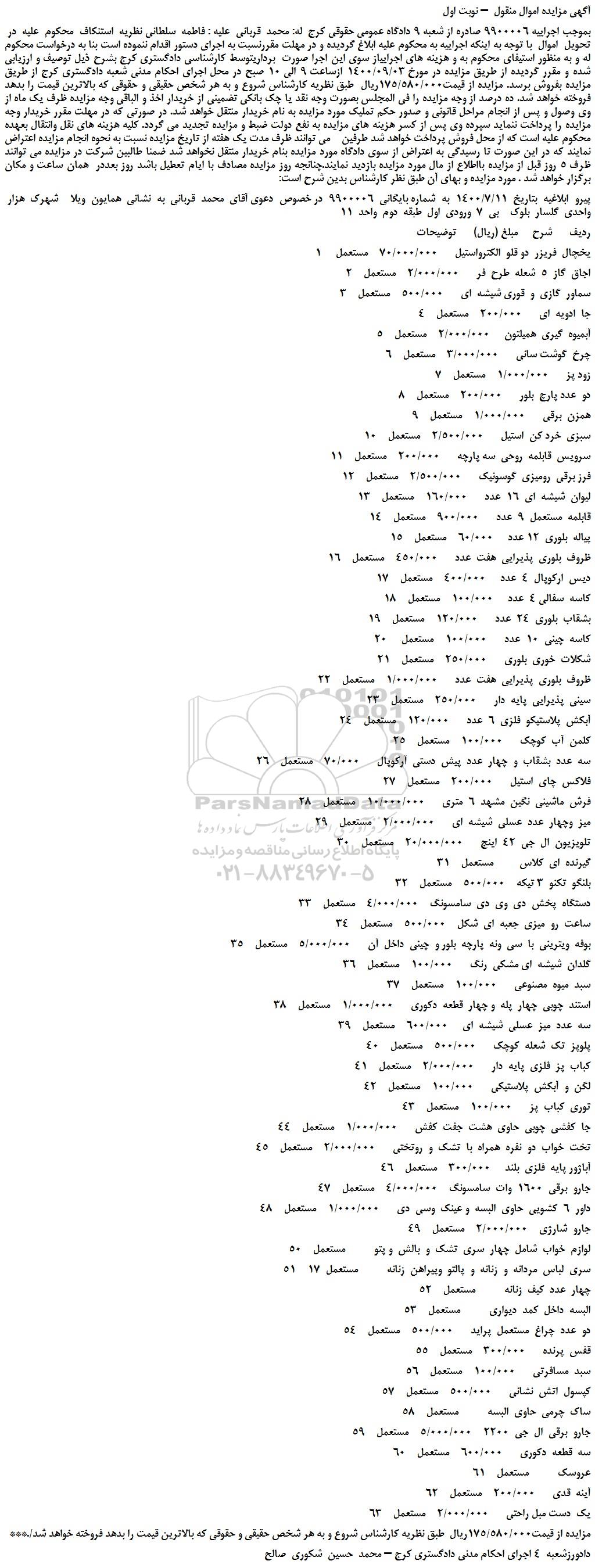 بموجب اجراییه 9900006 صادره از شعبه 9 دادگاه عمومی حقوقی کرج له: محمد قربانی علیه : فاطمه سلطانی نظریه استنکاف محکوم علیه در تحویل اموال با توجه به اینکه اجراییه به محکوم علیه ابلاغ گردیده و در مهلت مقررنسبت به اجرای دستور اقدام ننموده است بنا به درخواست محکوم له و به منظور استیفای محکوم به و هزینه های اجراییاز سوی این اجرا صورت برداریتوسط کارشناسی دادگستری کرج بشرح ذیل توصیف و ارزیابی شده و مقرر گردیده از طریق مزایده در مورخ 1400/09/03 ازساعت 9 الی 10 صبح در محل اجرای احکام مدنی شعبه دادگستری کرج از طریق مزایده بفروش برسد. مزایده از قیمت175/580/000ریال طبق نظریه کارشناس شروع و به هر شخص حقیقی و حقوقی که بالاترین قیمت را بدهد فروخته خواهد شد. ده درصد از وجه مزایده را فی المجلس بصورت وجه نقد یا چک بانکی تضمینی از خریدار اخذ و الباقی وجه مزایده ظرف یک ماه از وی وصول و پس از انجام مراحل قانونی و صدور حکم تملیک مورد مزایده به نام خریدار منتقل خواهد شد. در صورتی که در مهلت مقرر خریدار وجه مزایده را پرداخت ننماید سپرده وی پس از کسر هزینه های مزایده به نفع دولت ضبط و مزایده تجدید می گردد. کلیه هزینه های نقل وانتقال بعهده محکوم علیه است که از محل فروش پرداخت خواهد شد طرفین می توانند ظرف مدت یک هفته از تاریخ مزایده نسبت به نحوه انجام مزایده اعتراض نمایند که در این صورت تا رسیدگی به اعتراض از سوی دادگاه مورد مزایده بنام خریدار منتقل نخواهد شد ضمنا طالبین شرکت در مزایده می توانند ظرف 5 روز قبل از مزایده بااطلاع از مال مورد مزایده بازدید نمایند.چنانجه روز مزایده مصادف با ایام تعطیل باشد روز بعددر همان ساعت و مکان برگزار خواهد شد . مورد مزایده و بهای آن طبق نظر کارشناس بدین شرح است: