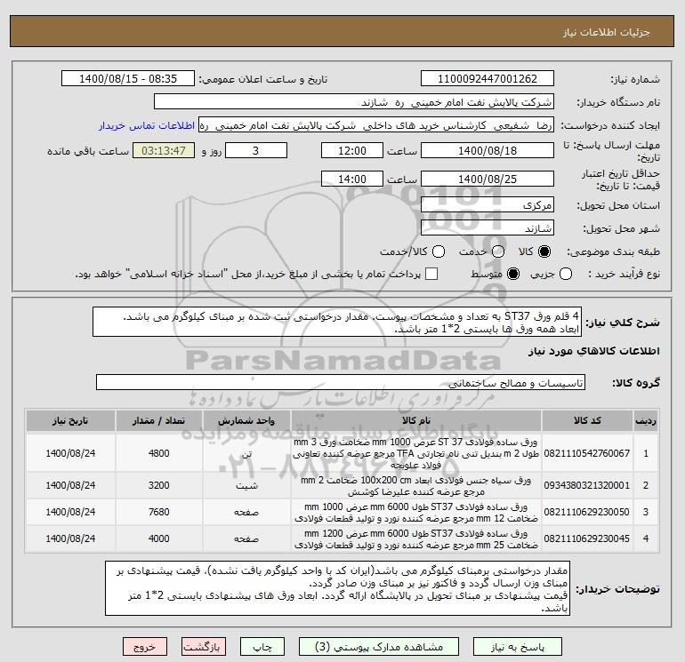 شرح کلی نیاز: 4 قلم ورق ST37 به تعداد و مشخصات پیوست. مقدار درخواستی ثبت شده بر مبنای کیلوگرم می باشد.