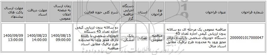 2000001017000047 | مناقصه عمومی یک مرحله ای دو سالانه بدون ارزیابی کیفی اجاره تعداد 45 دستگاه خودروی شخصی با راننده دارای مجوز ورود به محدوده طرح ترافیک مطابق اسناد مناق | مناقصه عمومی | تهران | بانک مسکن | دو سالانه بدون ارزیابی کیفی اجاره تعداد 45 دستگاه خودروی شخصی با راننده دارای مجوز ورود به محدوده طرح ترافیک مطابق اسناد مناقصه | 1400/08/15 09:00:00 | 1400/08/23 14:00:00 | 1400/09/09 13:00:00 |