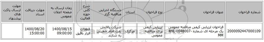 مناقصه، فراخوان ارزیابی کیفی مناقصه عمومی یک مرحله ای شماره RNL-0048007-MM, فراخوان ارزیابی کیفی مناقصه عمومی یک مرحله ای شماره RNL-0048007-MM