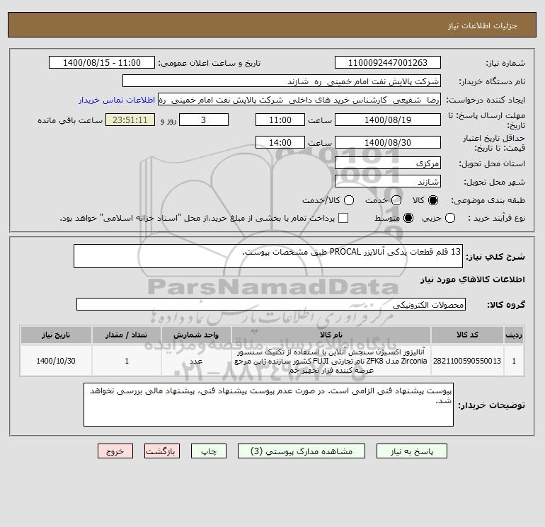 شرح کلی نیاز: 13 قلم قطعات یدکی آنالایزر PROCAL طبق مشخصات پیوست.