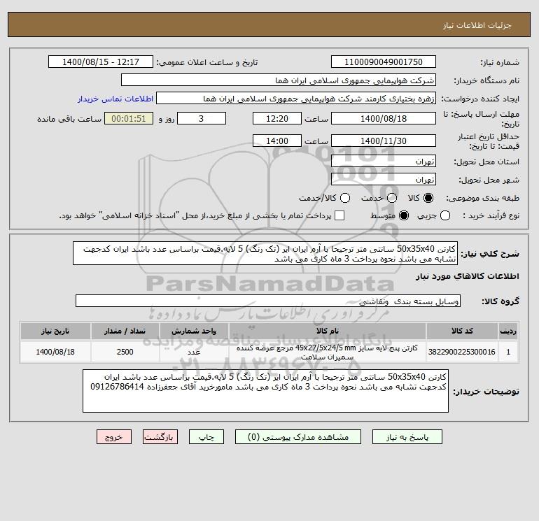 شرح کلی نیاز: کارتن 50x35x40 سانتی متر ترجیحا با آرم ایران ایر (تک رنگ) 5 لایه.قیمت براساس عدد باشد ایران کدجهت تشابه می باشد نحوه پرداخت 3 ماه کاری می باشد