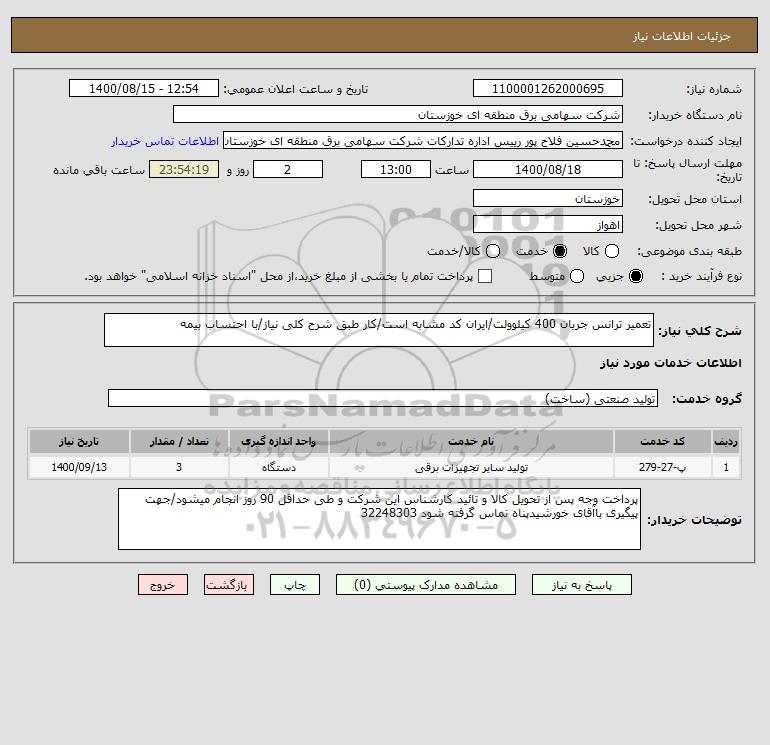 استعلام تعمیر ترانس جریان 400 کیلوولت/ایران کد مشابه است/کار طبق شرح کلی نیاز/با احتساب بیمه, استعلام تعمیر ترانس جریان 400 کیلوولت/ایران کد مشابه است/کار طبق شرح کلی نیاز/با احتساب بیمه