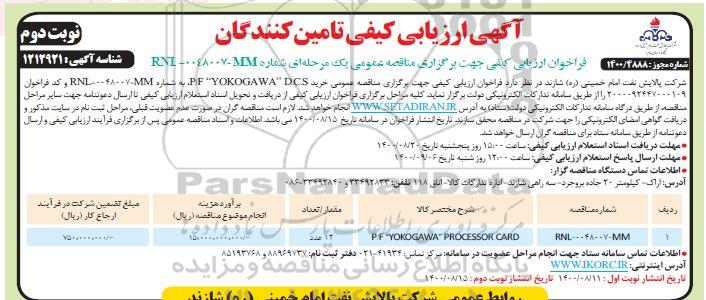 ارزیابی کیفی تامین کننده P/F "YOKOGAWA" PROCESSOR CARD- نوبت دوم از کلیه افراد متخصص و شرکت‌ها واجد شرایط دعوت به عمل می‌آید در مناقصه با کد خبرگزاری پارس نماد: 3922512 شرکت نمایند. این مناقصه در تاریخ 1400/08/15 شروع و مهلت آن تا تاریخ 1400/08/20 میباشد.