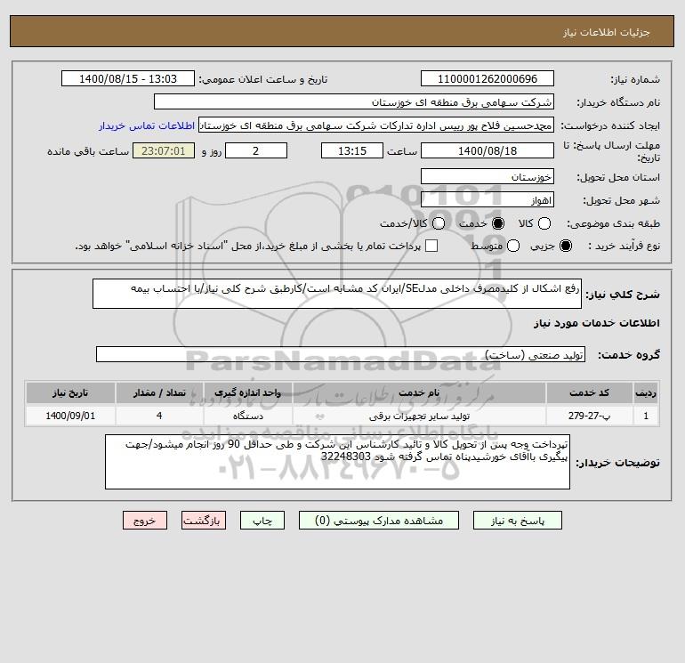 شرح کلی نیاز: رفع اشکال از کلیدمصرف داخلی مدلSE/ایران کد مشابه است/کارطبق شرح کلی نیاز/با احتساب بیمه