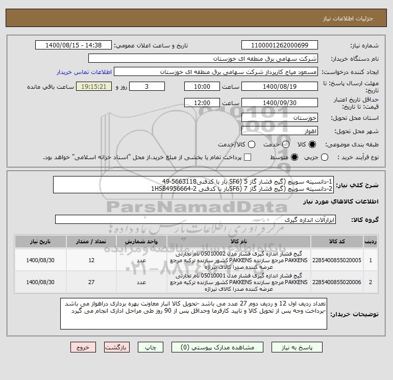 شرح کلی نیاز: 1-دانسیته سوییچ (گیج فشار گاز SF6) 5 بار با کدفنی5663118-49