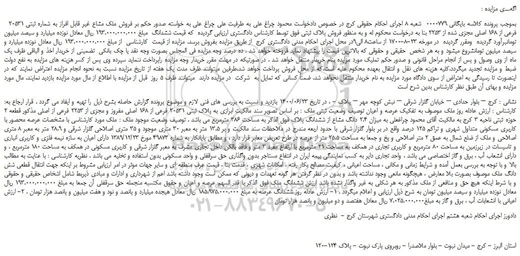 بموجب پرونده کلاسه بایگانی 0000779 شعبه 8 اجرای احکام حقوقی کرج در خصوص دادخواست محمود چراغ علی به طرفیت علی چراغ علی به خواسته صدور حکم بر فروش ملک مشاع غیر قابل افراز به شماره ثبتی 20531 فرعی از 168 اصلی مجزی شده از 2253 بنا به درخواست محکوم له و به منظور فروش پلاک ثبتی فوق توسط کارشناس دادگستری ارزیابی گردیده که قیمت ششدانگ مبلغ 193.000.000.000 ریال معادل نوزده میلیارد و سیصد میلیون تومانبرآورد گردیده ومقرر گردیده در مورخه 23-8-1700 از ساعت8 الی9در محل اجرای احکام مدنی دادگستری کرج از طریق مزایده بفروش برسد. مزایده از قیمت کارشناسی از مبلغ 193.000.000.000 ریال معادل نوزده میلیارد و سیصد میلیون تومانشروع میشود و به هر شخص حقیقی و حقوقی که بالاترین قیمت را پیشنهاد نماید فروخته خواهد شد . ده درصد وجه مزایده فی المجلس بصورت وجه نقد یا چک بانکی تضمینی از خریدار اخذ و الباقی ظرف یک ماه از وی وصول و پس از انجام مراحل قانونی و صدور حکم تملیک مورد مزایده بنام خریدار منتقل خواهد شد . در صورتیکه در مهلت مقرر خریدار وجه مزایده راپرداخت ننماید سپرده وی پس از کسر هزینه های مزایده به نفع دولت ضبط و مزایده تجدید میگردد.کلیه هزینه های نقل و انتقال بعهده محکوم علیه است.که از محل فروش پرداخت خواهد شد.طرفین میتوانند ظرف مدت یک هفته از تاریخ مزایده نسبت به نحوه انجام مزایده اعتراض نمایند که در اینصورت تا رسیدگی به اعتراض از سوی دادگاه مورد مزایده به نام خریدار منتقل نخواهد شد. ضمناً کسانی که تمایل به شرکت در مزایده دارند میتوانند ظرف 5 روز قبل از مزایده با اطلاع از مال مورد مزایده بازدید نمایند. مال مورد مزایده و بهای آن طبق نظر کارشناس بدین شرح است