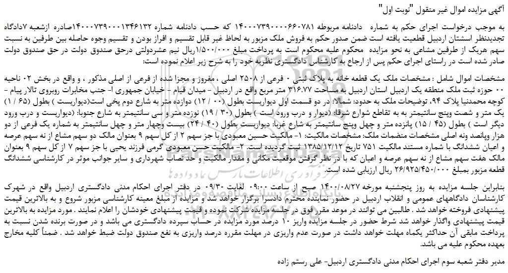 به موجب درخواست اجرای حکم به شماره دادنامه مربوطه 140007390000660781 که حسب دادنامه شماره 140007390001346132صادره ازشعبه 7دادگاه تجدیدنظر اسشتان اردبیل قطعیت یافته است ضمن صدور حکم به فروش ملک مزبور به لحاظ غیر قابل تقسیم و افراز بودن و تقسیم وجوه حاصله بین طرفین به نسبت سهم هریک از طرفین مشاعی به نحو مزایده محکوم علیه محکوم است به پرداخت مبلغ 1/500/000ریال نیم عشردولتی درحق صندوق دولت در حق صندوق دولت صادر شده است در راستای اجرای حکم پس از ارجاع به کارشناس دادگستری نظریه خود را به شرح زیر اعلام نموده است: