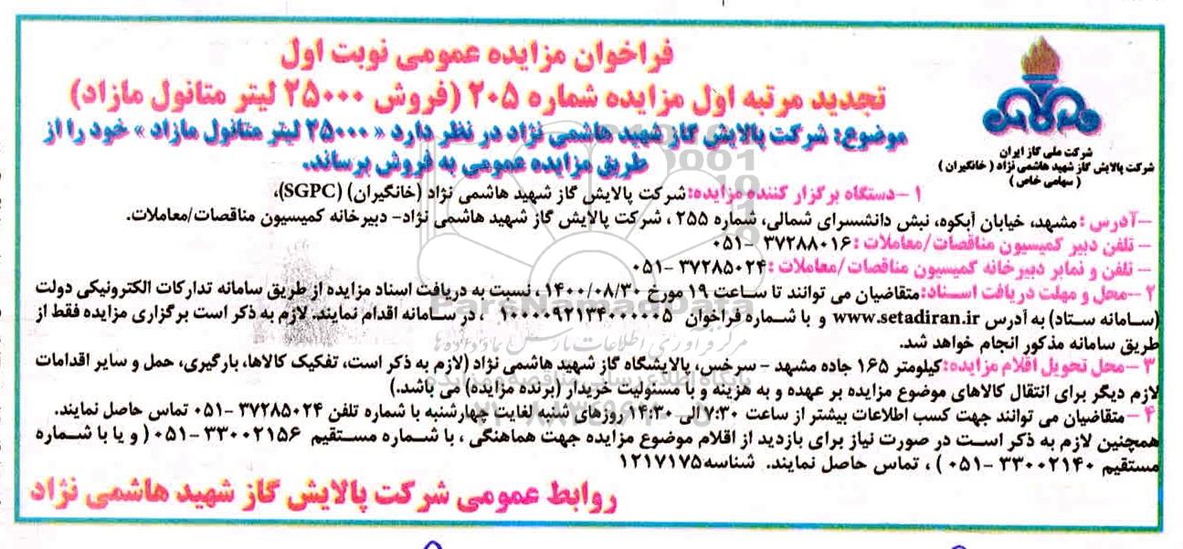 موضوع: شرکت پالایش گاز شهید هاشمی نژاد در نظر دارد فروش 25000 لیتر متانول مازاد خود را از طریق مزایده عمومی به فروش برساند