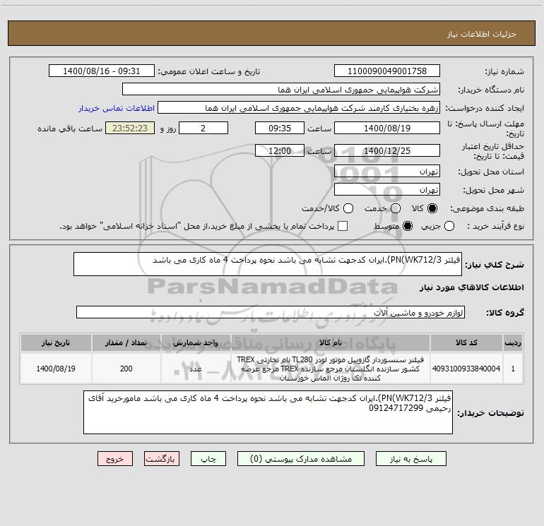 شرح کلی نیاز: فیلتر PN(WK712/3).ایران کدجهت تشابه می باشد نحوه پرداخت 4 ماه کاری می باشد
