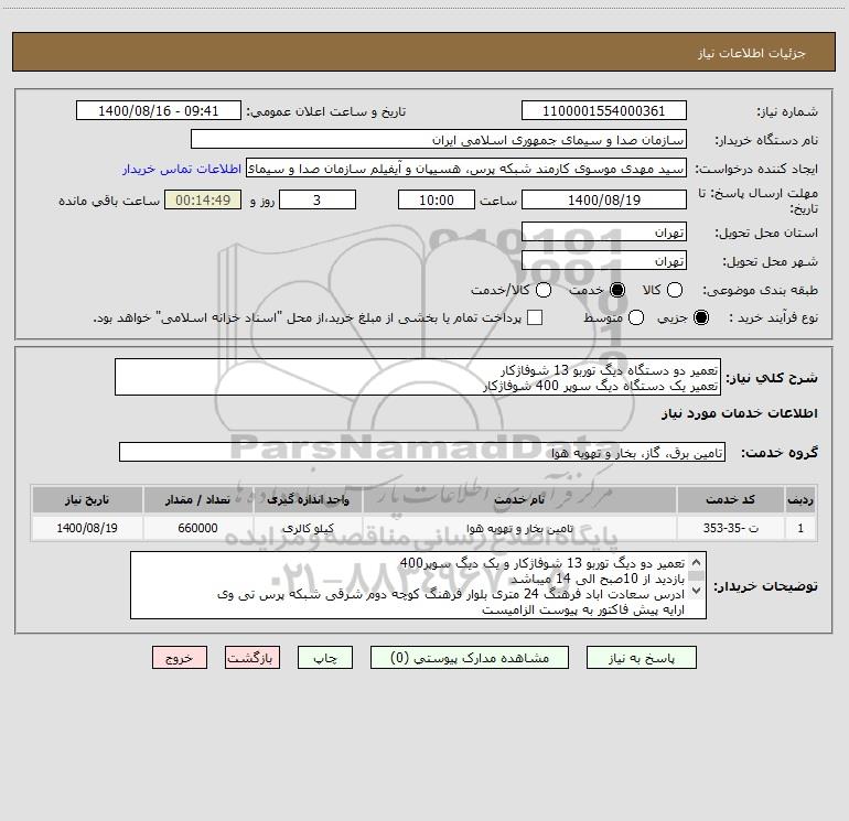 شرح کلی نیاز: تعمیر دو دستگاه دیگ توربو 13 شوفاژکار