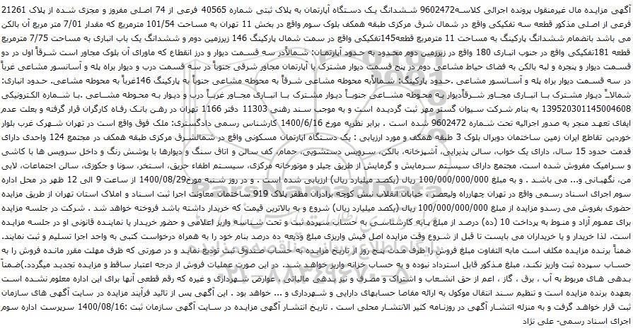 ششدانگ یک دستگاه آپارتمان به پلاک ثبتی شماره 40565 فرعی از 74 اصلی مفروز و مجزی شده از پلاک 21261 فرعی از اصلی مذکور قطعه سه تفکیکی واقع در شمال شرق مرکزی طبقه همکف بلوک سوم واقع در بخش 11 تهران به مساحت 101/54 مترمربع که مقدار 7/01 متر مربع آن بالکن می باشد بانضمام ششدانگ پارکینگ به مساحت 11 مترمربع قطعه145تفکیکی واقع در سمت شمال پارکینگ 146 زیرزمین دوم و ششدانگ یک باب انباری به مساحت 7/75 مترمربع قطعه 181تفکیکی واقع در جنوب انباری 180 واقع در زیرزمین دوم محدود به حدود آپارتمان: شمالاًدر سه قسمت دیوار و درز انقطاع که ماورای آن بلوک مجاور است شرقاً اول در دو قسمت دیوار و پنجره و لبه بالکن به فضای حیاط مشاعی دوم در پنج قسمت دیوار مشترک با آپارتمان مجاور شرقی جنوباً در سه قسمت درب و دیوار براه پله و آسانسور مشاعی غرباً در سه قسمت دیوار براه پله و آسانسور مشاعی .حدود پارکینگ: شمالاًبه محوطه مشاعی شرقاً به محوطه مشاعی جنوباً به پارکینگ 146غرباً به محوطه مشاعی. حدود انباری: شمالاً دیوار مشترک با انباری مجاور شرقاًدیوار به محوطه مشاعی جنوباً دیوار مشترک با انباری مجاور غرباً درب و دیوار به محوطه مشاعی .با شماره الکترونیکی 139520301145004608 به بنام شرکت سیوان گستر مهر ثبت گردیده است و به موجب سند رهنی 11303 دفتر 1166 تهران در رهن بانک رفاه کارگران قرار گرفته و بعلت عدم ایفای تعهد منجر به صدور اجرائیه تحت شماره 9602472 شده است . برابر نظریه مورخ 1400/6/16 کارشناس رسمی دادگستری: ملک فوق واقع است در تهران شهرک غرب بلوار خوردین تقاطع ایران زمین ساختمان دوبرال بلوک 3 طبقه همکف و مورد ارزیابی : یک دستگاه اپارتمان مسکونی واقع در شمالشرق مرکزی طبقه همکف در مجتمع 124 واحدی دارای قدمت حدود 15 سال، دارای یک خواب، سالن پذیرایی، آشپزخانه، بالکن، سرویس دستشویی، حمام، کف سالن و اتاق سنگ و دیوارها با پوشش رنگ و داخل سرویس ها با کاشی و سرامیک مفروش شده است. مجتمع دارای سیستم سرمایش و گرمایش از طریق چیلر و موتورخانه مرکزی، سیستم اطفاء حریق، استخر، سونا و جکوزی، سالن اجتماعات، لابی من، نگهبانی و... می باشد . و به مبلغ 100/000/000/000 ریال (یکصد میلیارد ریال) ارزیابی شده است . و در روز شنبه مورخ1400/08/29 از ساعت 9 الی 12 ظهر در محل اداره سوم اجرای اسناد رسمی واقع در تهران چهارراه ولیعصر ، خیابان انقلاب نبش کوچه برادران مظفر پلاک 919 ساختمان معاونت اجرا ثبت اسناد و املاک استان تهران از طریق مزایده حضوری بفروش می رسدو مزایده از مبلغ 100/000/000/000 ریال (یکصد میلیارد ریال) شروع و به بالاترین قیمت که خریدار داشته باشد فروخته خواهد شد . شرکت در جلسه مزایده برای عموم آزاد و منوط به پرداخت 10 (ده) درصد از مبلغ پایه کارشناسی به حساب سپرده ثبت و تحت شناسه واریز اعلامی و حضور خریدار یا نماینده قانونی او در جلسه مزایده است. لذا خریدار و یا خریداران می بایست تا قبل از شروع وقت مزایده اصل فیش واریزی مبلغ ودیعه ده درصد بنام خود را به همراه درخواست کتبی به واحد اجرا تسلیم و ثبت نمایند. ضمناً برنده مزایده مکلف است مابه التفاوت مبلغ فروش را ظرف مدت پنج روز از تاریخ مزایده به حساب صندوق ثبت تودیع نماید و در صورتی که ظرف مهلت مقرر مانده فروش را به حساب سپرده ثبت واریز نکند، مبلغ مذکور قابل استرداد نبوده و به حساب خزانه واریز خواهد شد. در این صورت عملیات فروش از درجه اعتبار ساقط و مزایده تجدید میگردد.)ضمناَ بدهی های مربوط به آب ، برق ، گاز ، اعم از حق انشعاب و اشتراک و مصرف و نیز بدهی مالیاتی ، عوارض شهرداری و غیره که رقم قطعی آنها برای این اداره معلوم نشده است بعهده برنده مزایده است و تنظیم سند انتقال موکول به ارائه مفاصا حسابهای دارایی و شهرداری و ... خواهد بود . این آگهی پس از تائید فرآیند مزایده در سایت آگهی های سازمان ثبت قرار خواهد گرفت و به منزله انتشار آگهی در روزنامه کثیر الانتشار محلی است .